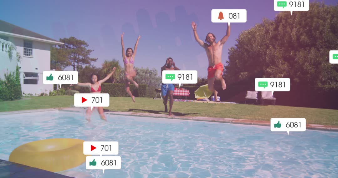 Digital blend of social networking notifications with real outdoor pool activity. Captures excitement of summer leisure along with modern digital culture. Perfect for illustrating technology's role in everyday fun, social media impact with videory reflecting youthful enjoyment in a bright, aquatic environment. Suitable for tech and lifestyle promotions focused on vibrant social community themes.