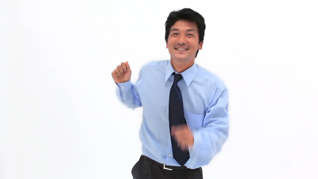 This video features a smiling man dancing joyfully while wearing business attire, set against a white background. Use this energetic and positive video in marketing materials promoting office culture, career events, productive work environments, or to symbolize work-life balance.