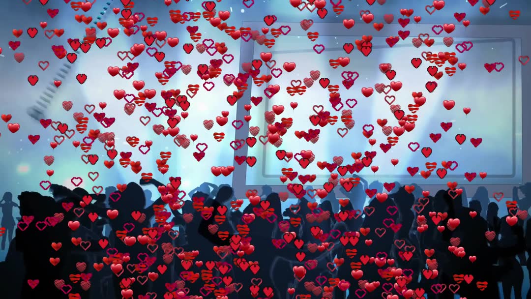 Animated silhouettes are celebrating at a lively event, enhanced by blue lighting and countless floating red hearts and digital icons. Perfect for illustrating joyful parties, energetic raves, or modern digital celebrations. Suited for event promotions, party invitations, or artistic backdrops.