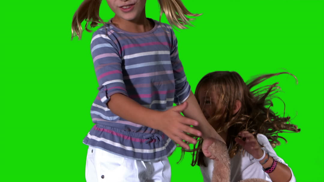 Two sisters enjoy a playful moment together, clutching a teddy bear. The green screen backdrop suggests versatility for media projects where background customization is key. This vibrant scene of sisterhood and youthful joy can be used for advertisements, family-centered projects, or educational materials focused on children and playful activities.