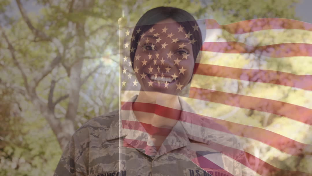 An African American mother in military uniform smiling broadly, with her children. A transparent overlay of the American flag conveys a sense of patriotism and pride. This scene is perfect for themes related to military family life, patriotism, and celebrations honoring servicemen and servicewomen. Ideal for content on national holidays such as Veterans Day, Independence Day, and activities promoting support for military families.