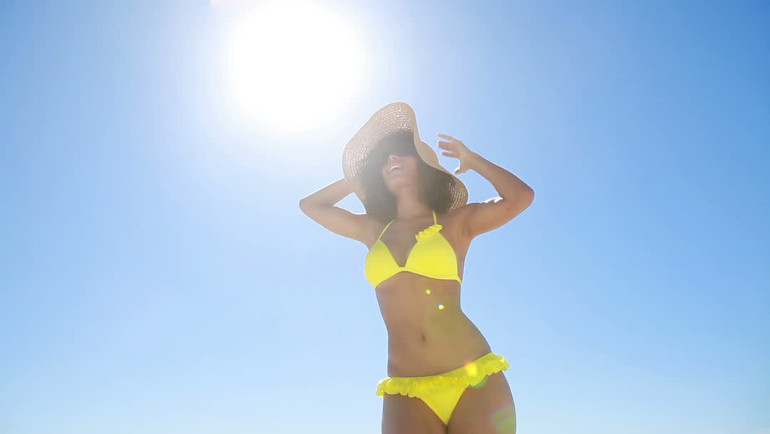 The cheerful scene captures a woman in a vibrant yellow bikini joyfully dancing under the bright sunshine. Her wide-brimmed sun hat adds a touch of elegance as she enjoys a day at the beach. This captures the essence of summer fun and can be used for travel brochures, beach-inspired fashion promotions, or lifestyle blogs emphasizing joyful relaxation and sunny vacations.