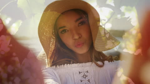 A cheerful woman enjoying an outdoor celebration, wearing a sun hat and surrounded by warm, gentle sunlight infused with overlay effects of leaves. This can be used for themes related to summer, joy, lifestyle, and carefree moments. Ideal for advertising travel destinations, vacation spots, and social media content conveying happiness and celebration.