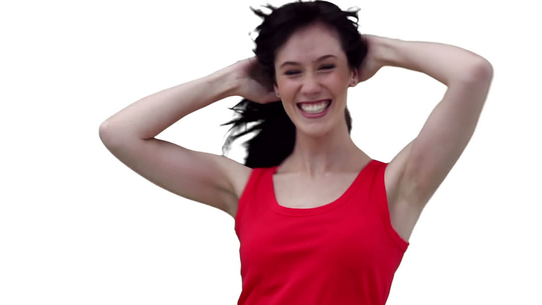 This vibrant scene features a woman in a red tank top smiling widely, creating an energetic and joyful atmosphere. Her joyful expression and dynamic pose make this applicable for marketing campaigns focusing on happiness, positive energy, or lifestyle products. Ideal for advertising haircare products, showcasing happiness in everyday life, or as motivational material highlighting lively spirits and confidence.