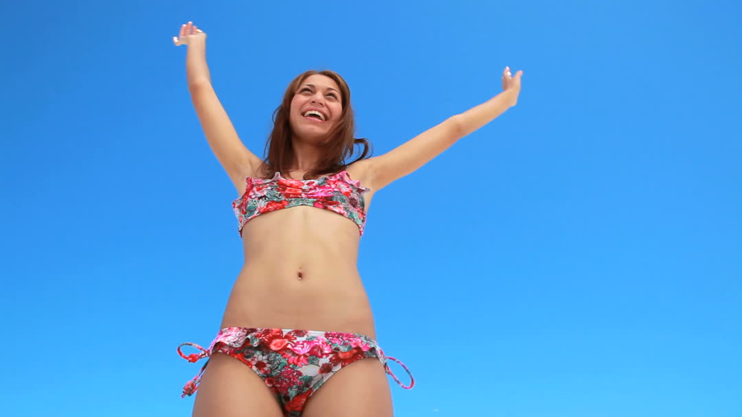 - Joyful Woman Dancing in Bikini Against Blue Sky