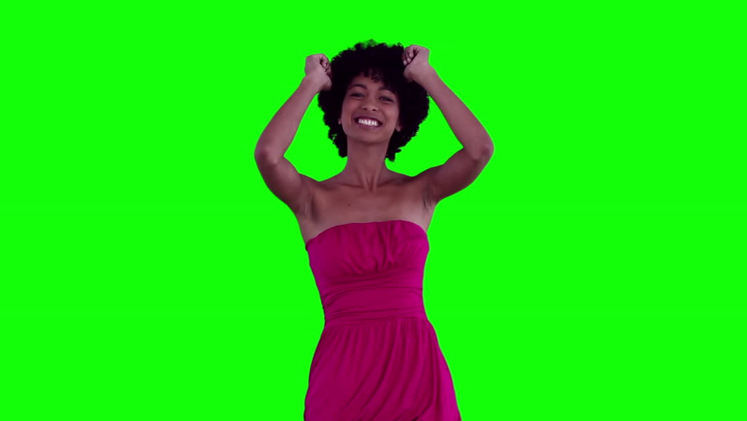 A woman with raised arms dancing happily in front of a green screen background, wearing a vibrant pink dress. Perfect for media projects needing a carefree and joyful touch, showcasing fun and celebration. Suitable for use in marketing, advertisements, or social media campaigns to convey happiness and enthusiastic expression.
