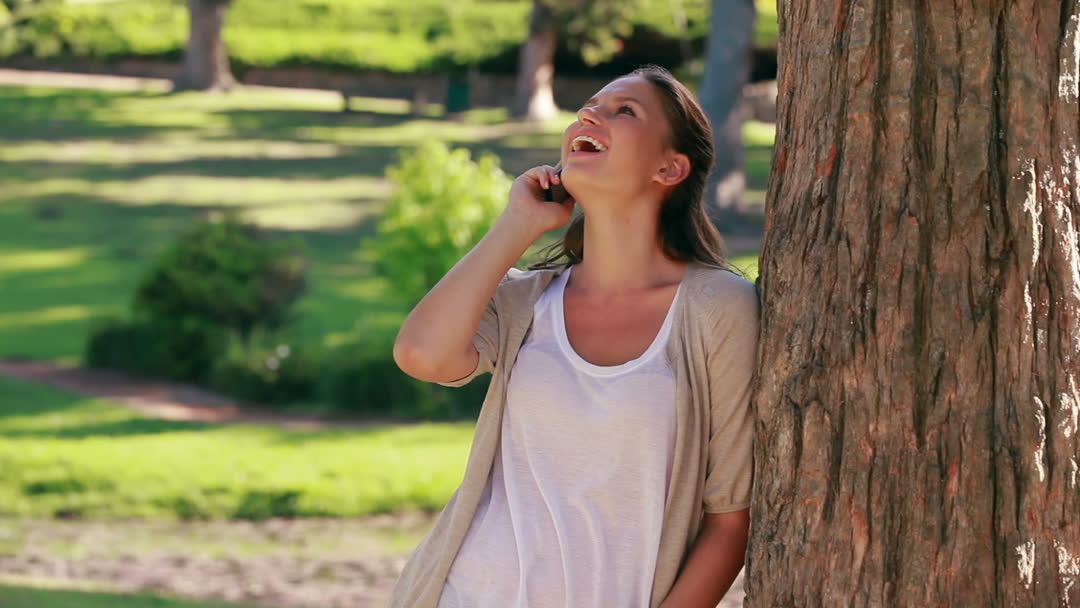 Woman leaning against a tree talking on her phone in a sunlit park, signaling comfort and relaxation. Ideal for use in advertisements promoting mobile services, lifestyle blogs focused on relaxation, and outdoor motivational videory.