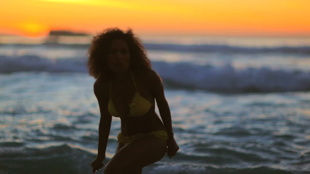 A cheerful woman is dancing in the ocean with a stunning sunset backdrop, creating a vibrant summer scene. This video captures the feeling of leisure and happiness, making it ideal for use in advertising beach resorts, travel magazines, summer promotions, or wellness articles focusing on joyful outdoor activities.