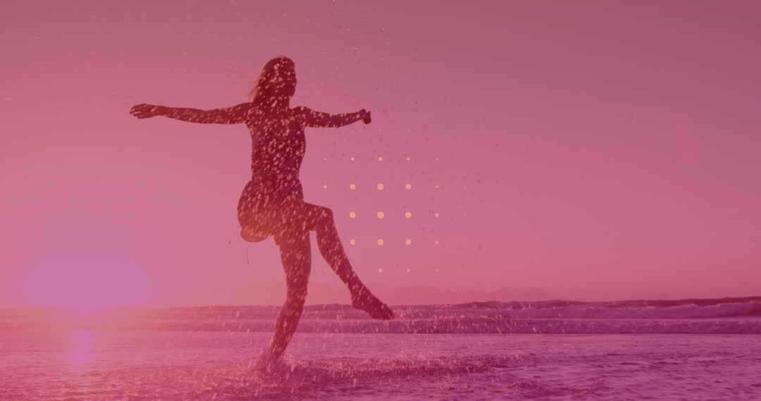 Silhouette of woman dancing exuberantly in the ocean as the sun sets, surrounded by pinkish hues and sparkling lights. Captures essence of freedom and enjoyment in nature. Ideal for concepts of carefree living, summer fun, and active lifestyle promotions.