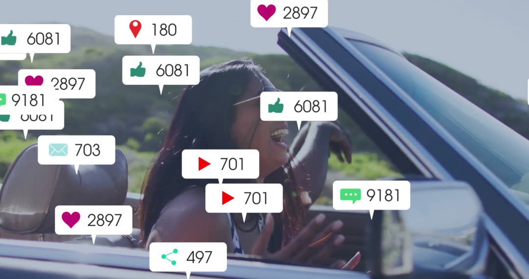 Image shows a joyful woman driving a convertible surrounded by animated social media notifications. Ideal for themes focusing on digital engagement, travel and technology, the modern intersection of tech and lifestyle, marketing campaigns about online interaction, or automotive advertisements highlighting experience and connectivity.