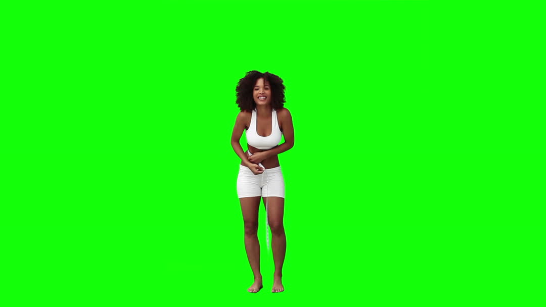 The woman, captured against a bright green background, is measuring her waist while smiling. This could be used in materials related to healthy lifestyle, weight loss, fitness goals, and wellness promotions. The green screen allows for easy editing and can be adapted for various marketing and educational uses.