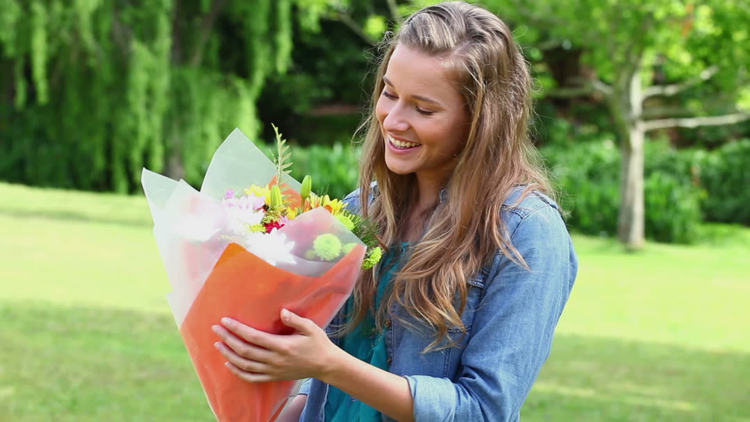 - Joyful Woman Receiving Bouquet in Green Park Setting
