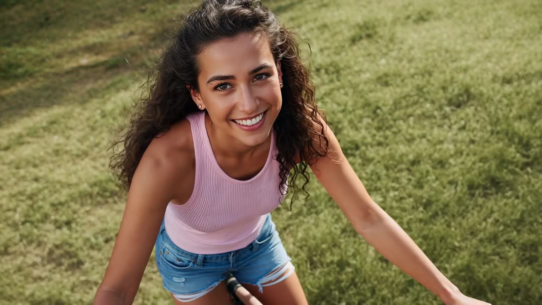 AI Generated Video. A woman is joyfully riding a bicycle through a grassy field, wearing a pink top and jean shorts, encapsulating feelings of freedom and vitality. Suitable for use in campaigns promoting active lifestyles, outdoor adventures, or city biking solutions. This scene emphasizes wellness and the carefree nature of outdoor recreation.