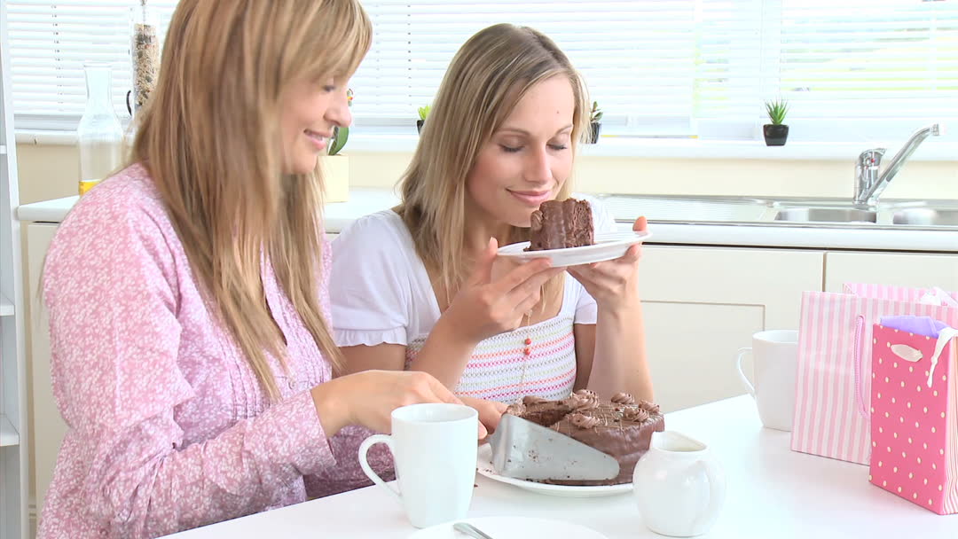 Joyful Women Indulging in Chocolate Cake in Bright Kitchen Video