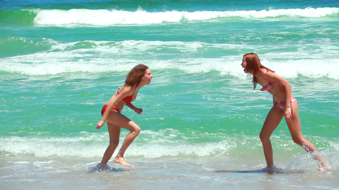Two women in swimwear joyfully playing with waves on sandy beach. Perfect for concepts related to summer vacations, joyful leisure time, friendship, outdoor fun, and holiday travel promotions.