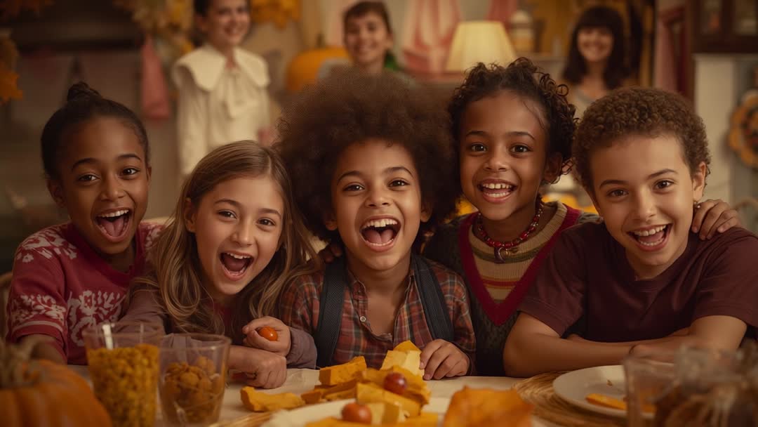 AI Generated Video. Happy group of diverse children delves into an autumnal celebration with laughter and joy, each reaching for orange candies spread across table. Warm and cozy backdrop decorated with pumpkins brings festive fall ambiance alive. Perfect for illustrating concepts of friendship, diversity, joy, and the spirit of seasonal celebration. Suitable for autumn-themed campaigns or cultural community projects highlighting togetherness and youth.