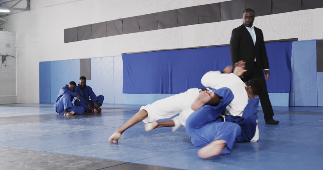 - Judo Athletes Training with Coach in a Modern Dojo