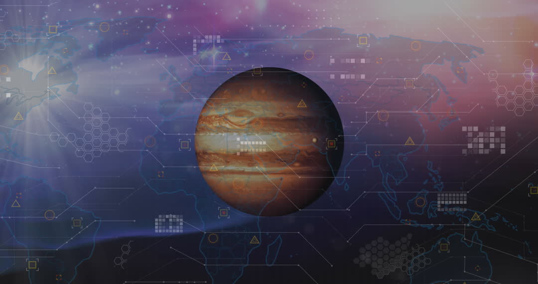 Jupiter is prominently displayed against a backdrop of a digital world map with abstract data elements, representing global data processing technology. Useful in illustrating technology concepts, scientific research visuals, educational content, space exploration inspirations, and futuristic design themes.