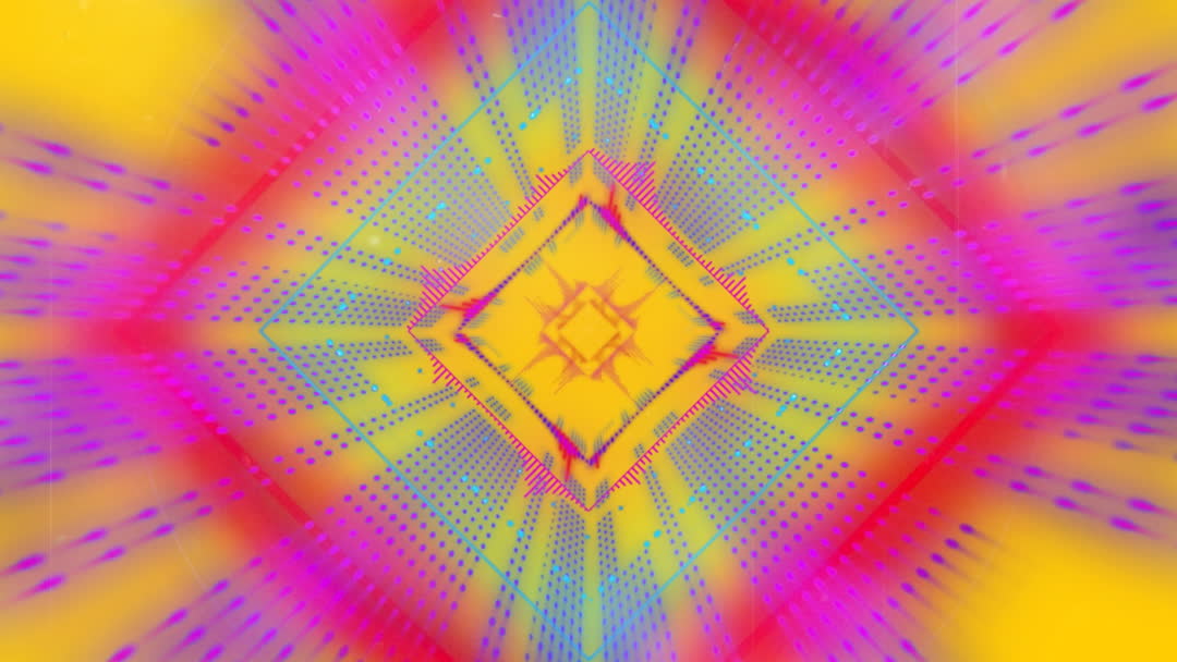 This colorful kaleidoscopic animation features dynamic geometric patterns on a vibrant yellow background, creating a stunning optical illusion effect. It is perfect for use in creative projects such as video backgrounds, digital displays, and interactive media. Also ideal for enhancing psychedelic art collections or presentations requiring lively and energetic visuals.