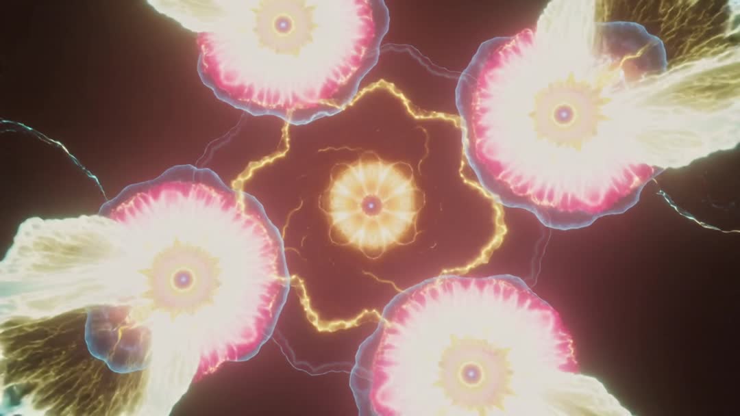 AI Generated Video. Featuring five radial neon mandalas pulsing outward and converging into glowing electric star, with lightning-like filaments arcing across deep dark void. Showcasing bright color palette of pink, yellow, blue and gold, creating high-energy psychedelic motion. Perfect for looping background for music visuals, VJ performances, live shows, club projection, electronic music videos. Also serving as eye-catching opener for sci-fi title sequences, tech presentations, digital art installations. Delivering hypnotic meditation visual or social media clip for reels and ads. Providing loopable video frame for editing, color grading and motion design projects.