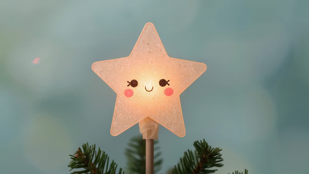 AI Generated Video. Footage capturing glittery star tree topper glowing above fir branches, featuring kawaii face, soft warm center light, teal bokeh background. Close-up framing and shallow depth of field creating cozy festive mood, evoking childhood wonder and seasonal charm. Suiting holiday marketing, online store hero clips, social media reels, seasonal greeting animations, nursery decor promotions. Working well as loopable clip for Instagram Stories, TikTok, header video for e-commerce listings, background for greeting cards and YouTube intros. Color palette combining warm peach light and cool teal hues supporting modern holiday designs. Ready for overlaying text, logos, animated particles, or product labeling. Ideal for designers, retailers, content creators, craft bloggers producing seasonal campaigns.