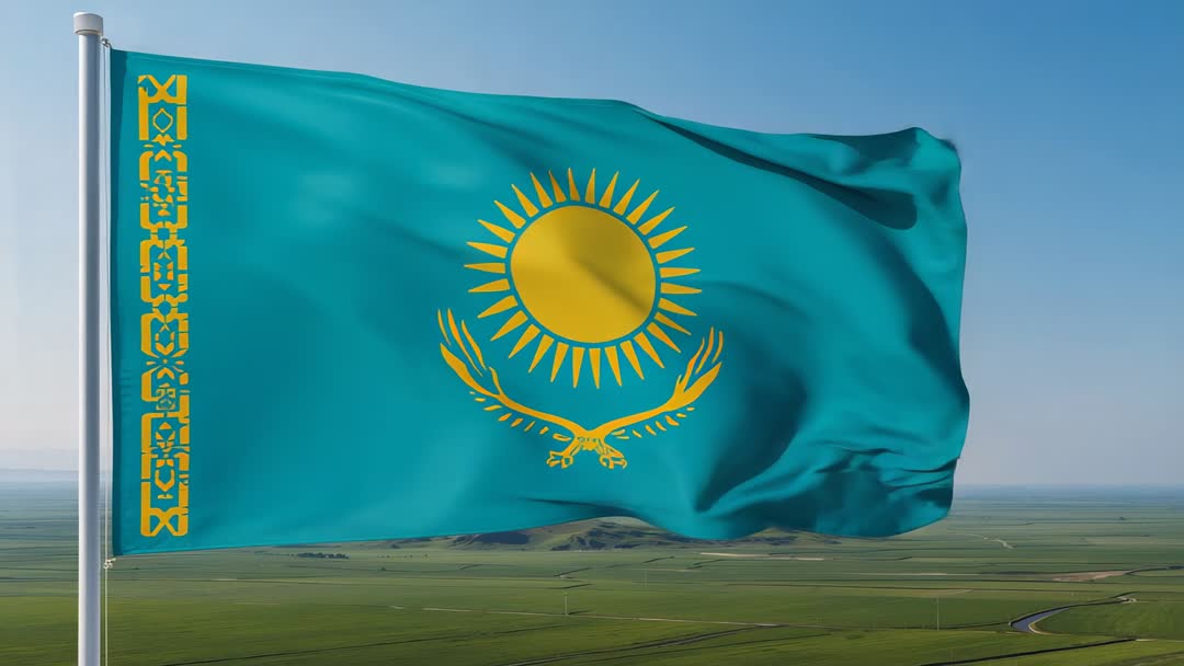 - Kazakhstan Flag Fluttering Over Open Steppe Showing Golden Sun and Eagle Emblem on Pole