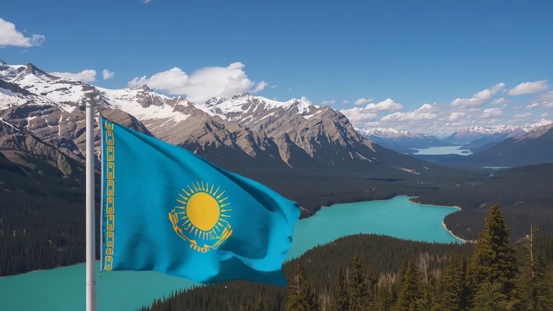 AI Generated Video. Showing Kazakhstan flag fluttering on metal pole above turquoise alpine lake, framed by snowcapped mountain range and dense conifer forest. Camera panning slowly to reveal layered ridgelines and distant glacial lakes, while wind animates flag and creates dynamic foreground movement. Vibrant color contrast between cerulean water and golden sun emblem offering strong composition and space for overlay text in sky area. Use for national tourism promos, cultural presentations, news segments about Kazakhstan, travel website headers, social media shorts, event openers, and environmental campaigns. Recommended editing ideas: slow-motion clips for dramatic effect, color grading to enhance turquoise tones, lower-third placement over lake, and gentle parallax for cinemagraphs. Footage suitable for 4K timelines and widescreen cinematic projects.
