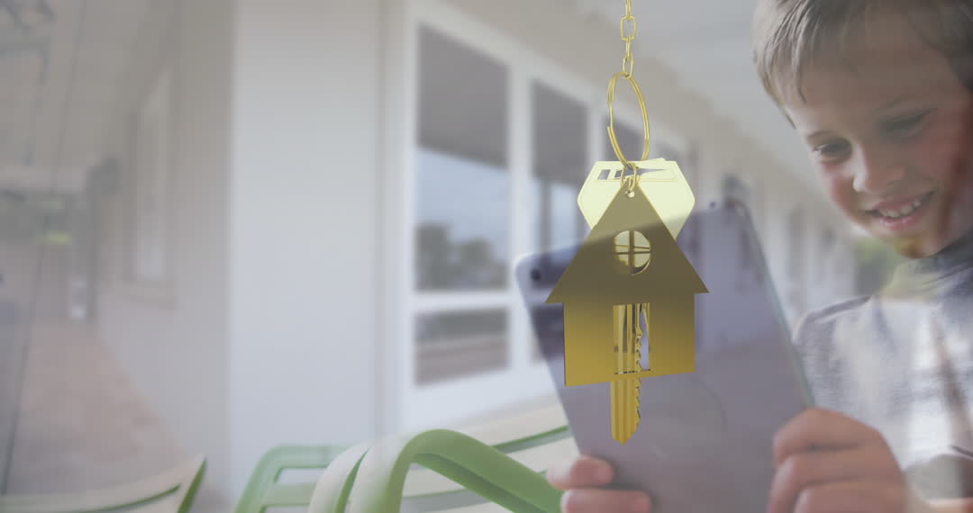 - Key with House Keychain Animation Over Boy Using Tablet