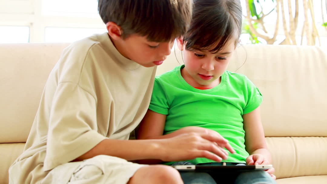 The scene depicts two children actively using a tablet computer while sitting comfortably on a couch in a well-lit living room. The video showcases themes of leisure, sibling connectivity, modern family life, and the embrace of technology in everyday activities. Suitable for educational materials, technology advertisements, parenting blogs, and content focusing on digital literacy among young children.