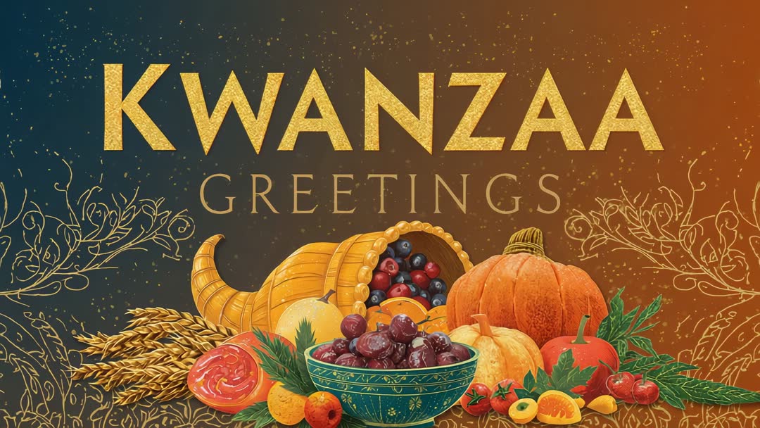 - Kwanzaa Greetings Banner with Pulsing Gold Text, Cornucopia Harvest and Glowing Sparks