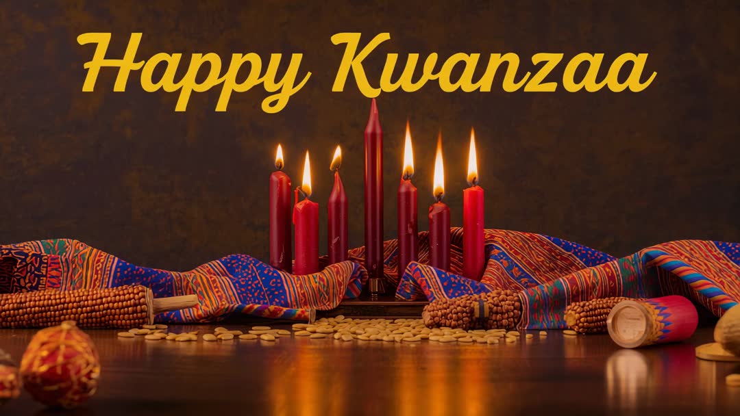 - Kwanzaa Kinara Flickering Seven Lit Candles on Mkeka with Harvest Corn and Drum