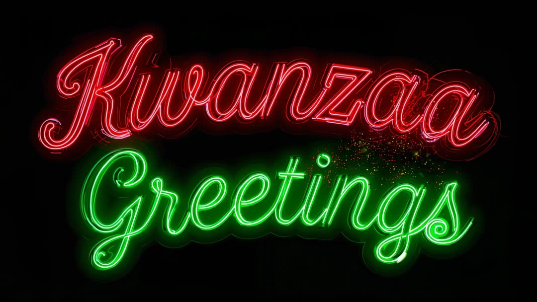 AI Generated Image. Video clip showing pulsing neon script reading Kwanzaa Greetings in crimson and emerald hues, emitting scattered sparkles from red lettering and warm halo glow around green script. Animation featuring smooth flicker, subtle tube reflections, and pulse-synced brightness for authentic neon feel. Looping short clip designed for seamless playback on social feeds, email headers, digital signage, and event intros. Ideal for holiday marketing, cultural celebration promos, greeting card videos, in-store displays, and website hero banners. File-ready format suggestions: use as MP4 loop, overlay with alpha channel for easy compositing, adjust color grading for brand integration.