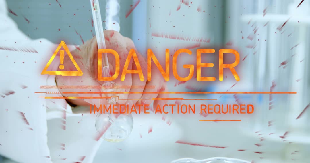 Showing chemist placing pipette above round-bottom flask while adding liquid, overlaid with bold orange DANGER graphic and 'IMMEDIATE ACTION REQUIRED' banner. Featuring red particle streaks adding sense of contamination and high urgency. Creating tense, authoritative mood suitable for safety communication and emergency alerts. Working well as training video clip, safety course opener, breaking news graphic, website hero banner, or social media alert. Supporting use in lab safety presentations, chemical hazard awareness campaigns, emergency response drills, and corporate compliance materials. Providing strong visual cue for messaging about contamination, protocol breaches, spill response, and risk management.