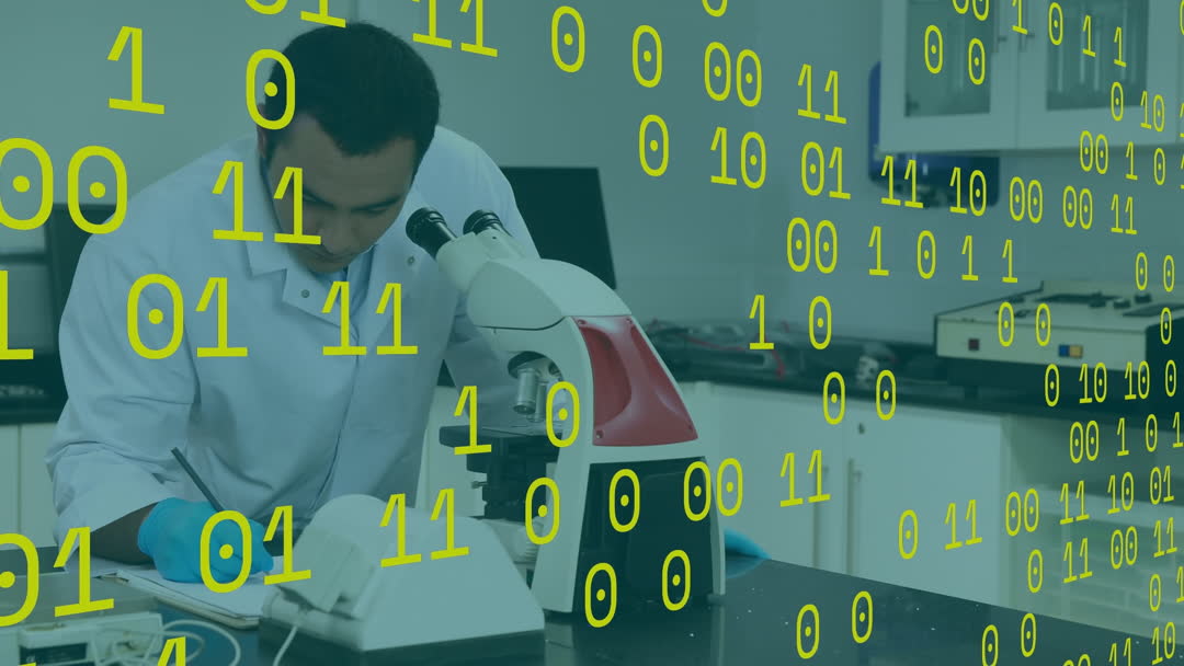 This video features a lab technician wearing a white coat working with a microscope in a laboratory while a transparent layer of binary code is overlaid. This digital element symbolizes the interaction between traditional scientific techniques and modern data processing. Perfect for illustrating biotech innovations, data-driven scientific research, and the integration of digital technologies in laboratories.