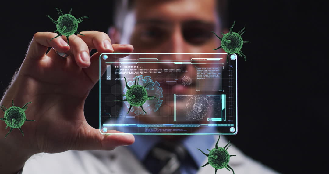 - Lab Technician Analyzing Virtual Virus Data on Digital Card