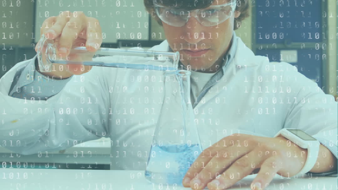 A lab technician pours liquids in a laboratory while binary code flows over the scene, symbolizing the integration of digital technology in scientific research. This video can be used for promoting advancements in chemistry, advertising tech-driven laboratory solutions, or illustrating scientific papers focused on data-driven research methodologies.