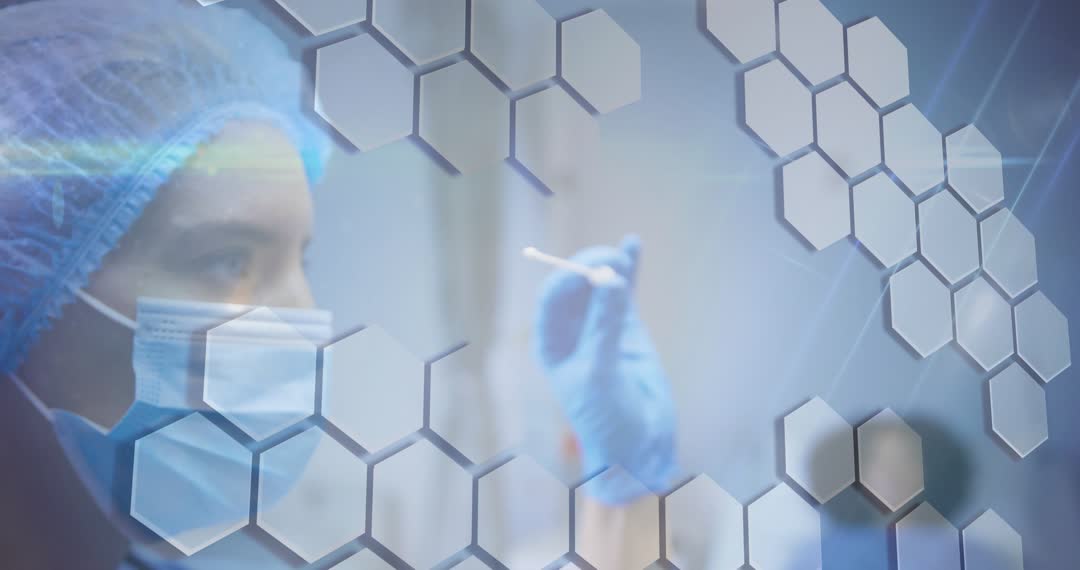 Lab technician wearing protective gear and mask carefully inspecting swab against digital hexagon grid background. This represents cutting-edge healthcare innovation and sterile working conditions in biotechnology and medical research fields. Useful for stock footage relating to medical advancements, diagnostic procedures, laboratory environment, and technological development in healthcare.