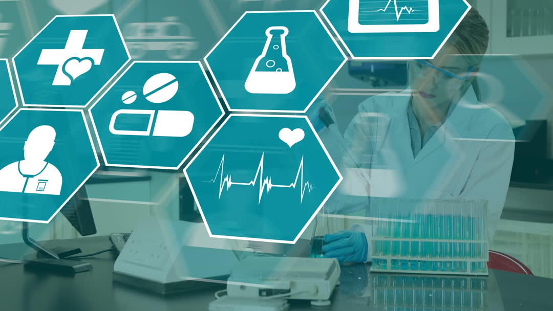 Laboratory Technology: Scientist Working with Healthcare Icons Overlay Video