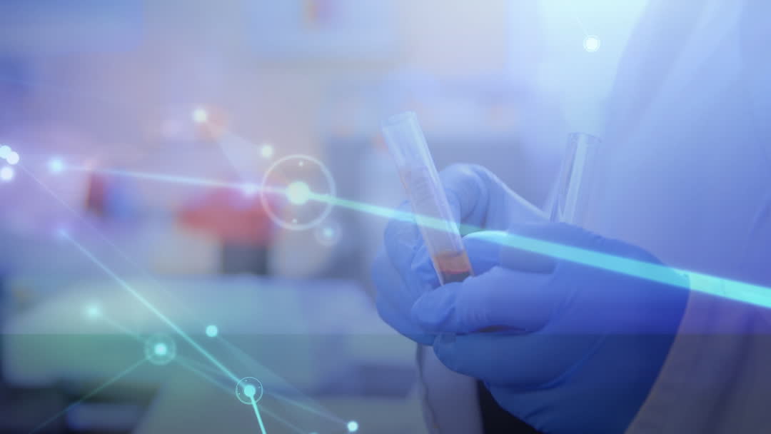 Laboratory worker wearing gloves holds samples with an overlay of digital connections, signifying integration of technology in scientific research. It is useful for illustrating concepts of modern science, digital transformation in medical fields, and innovation in labs. Suitable for presentations, educational content, and technology-oriented themes in life sciences.