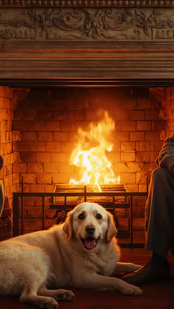 AI Generated Image. Vertical video showing Labrador retriever lying on carpet before glowing hearth, panting calmly as flames flicker and cast warm amber light. Composition focusing on dog in foreground with partial human legs at right edge, conveying companionship and cozy domestic atmosphere. Color palette dominated by warm oranges and deep browns, creating inviting seasonal mood. Use for social media reels, vertical ad spots, mobile wallpapers, holiday greeting clips, pet brand promotions, home decor and interior design videos, cabin or lodge marketing, lifestyle blogs, and relaxation content. Working well for promoting pet care products, cozy apparel, home heating systems, fireplace accessories, and family holiday campaigns. Include loop-friendly edits for ambient displays and in-store seasonal playlists. Provide slow pan or static shot options to emphasize firelight and facial expression of dog. Vertically framed composition optimized for mobile viewing and short-form platforms. Recommended color grading to preserve warm highlights and natural shadow detail. Add subtle ambient soundtrack featuring crackling fire and soft breathing to enhance cozy mood. Suitable for creating calming background visuals, seasonal marketing reels, pet lifestyle storytelling, and hospitality or rental listing promotions.