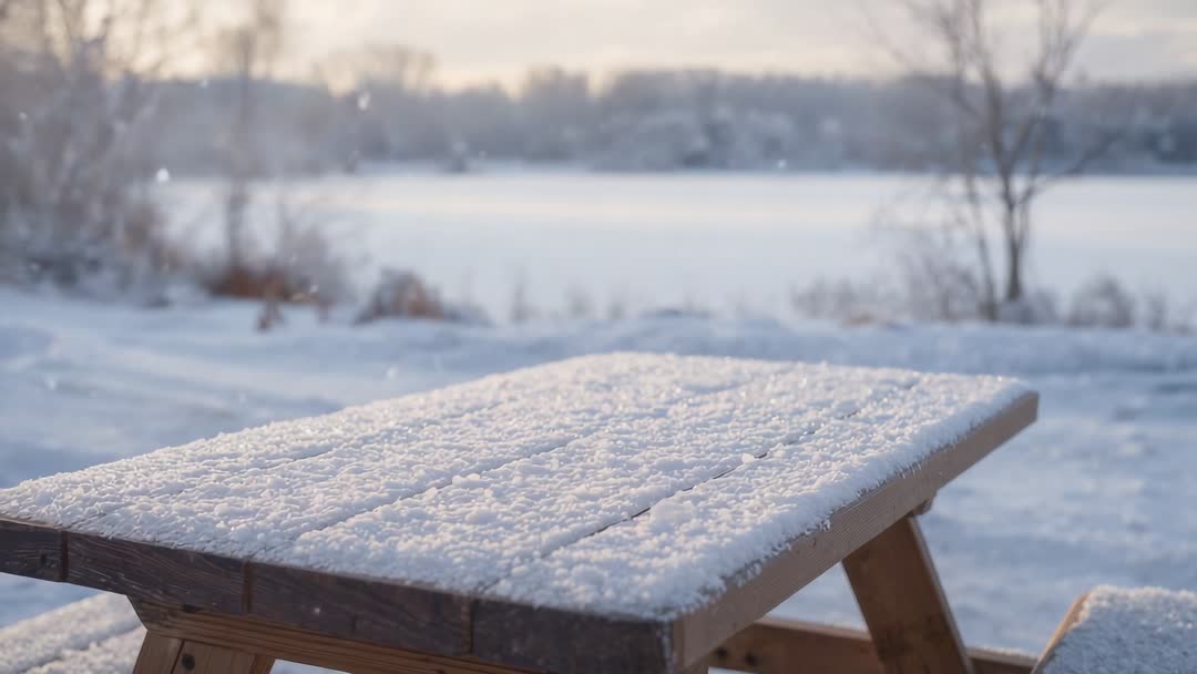 - Lakeside picnic table collecting fresh snowfall at sunrise, gentle snowflakes falling