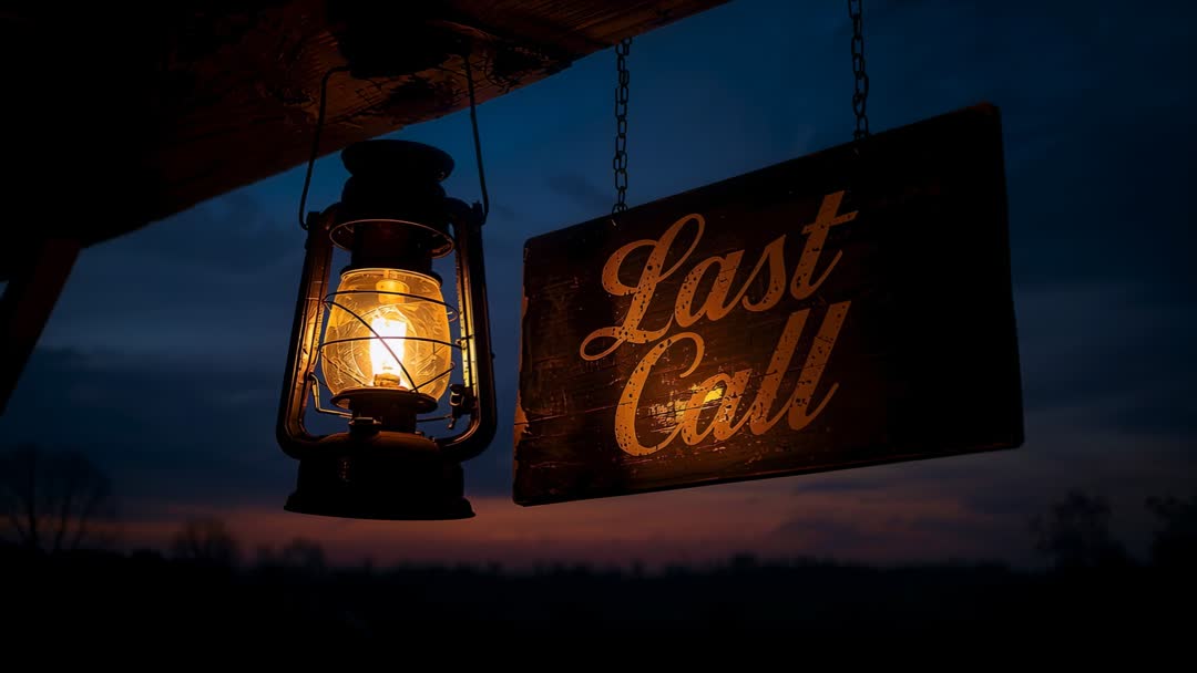 AI Generated Image. Video clip capturing flickering lantern casting warm amber glow beside Last Call sign swaying from wooden beam at dusk. Composition emphasizing close-up of lantern and sign against deep blue twilight and soft horizon silhouette. Mood conveying rustic charm, nostalgia, quiet closing time atmosphere. Ideal for illustrating bar closing scenes, pub or tavern promotions, hospitality campaigns, evening event trailers, website banners, social media stories, background for countdown to closing. Useful for editorial use in articles about nightlife transitions, small town Americana, vintage decor, or seasonal autumn evenings. Color palette featuring warm amber highlights and cool blue shadows, lending strong contrast for overlaying text or animated graphics. Licensing-friendly asset for filmmakers, advertisers, content creators, hospitality marketers, event planners.
