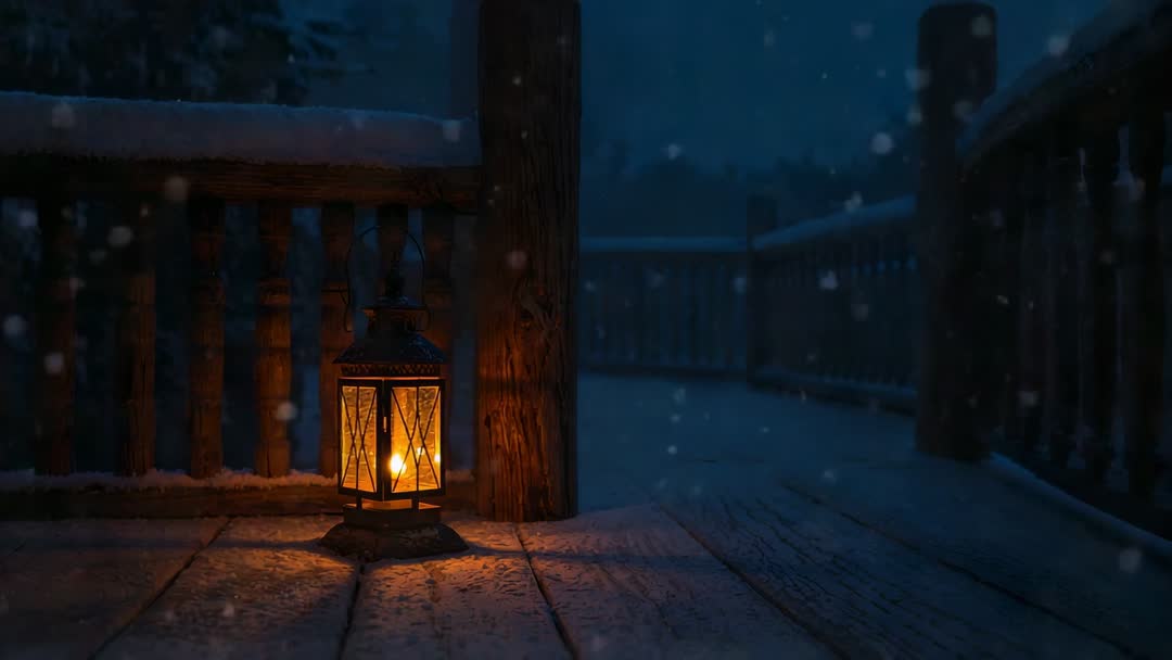 AI Generated Video. Video showing lantern flickering on snow-dusted wooden deck at night, candlelight casting warm glow across planks. Snowflakes drifting gently, creating calm, cozy atmosphere and evoking solitude and nostalgia. Ideal for holiday greeting video, winter product promotion, hospitality or cabin rental marketing, and mood-setting website hero banners. Suitable as cinematic B-roll for film projects, meditation or relaxation apps, book cover or poster for winter-themed stories. Recommend slow pan and subtle color grading to enhance contrast between warm lantern glow and cool blue night.