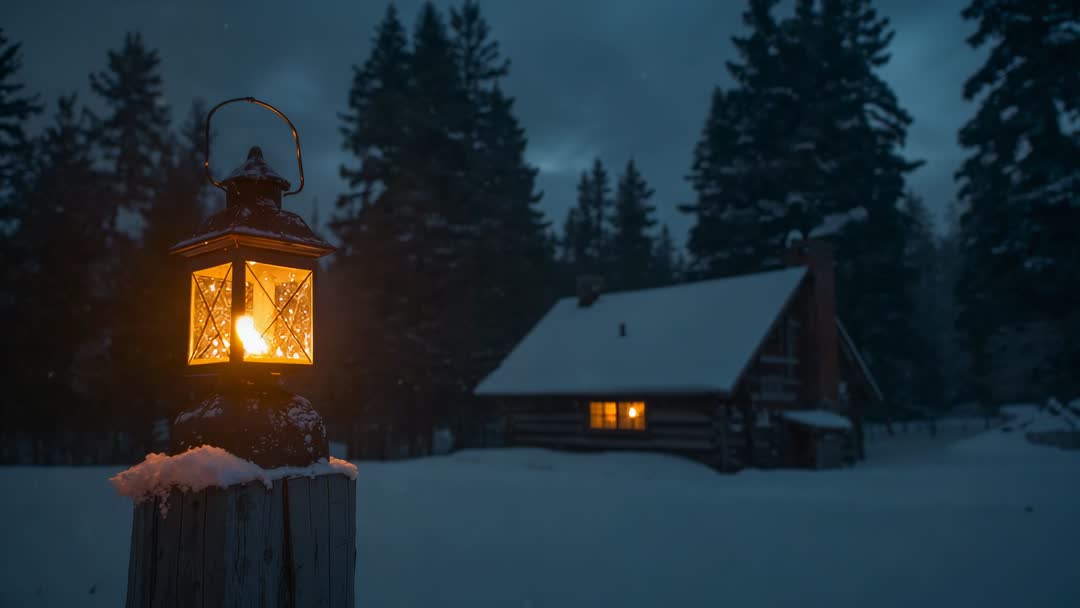 - Lantern glowing on snow-covered post at dusk, flame flickering while cabin windows glow