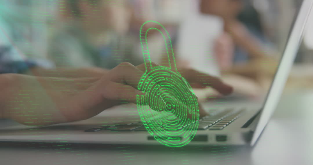 Shows hands on a laptop keyboard with an animation of a fingerprint lock. Represents digital security measures like biometric authentication in technology. Useful for content on cybersecurity, identity protection strategies, and biometric advancements.