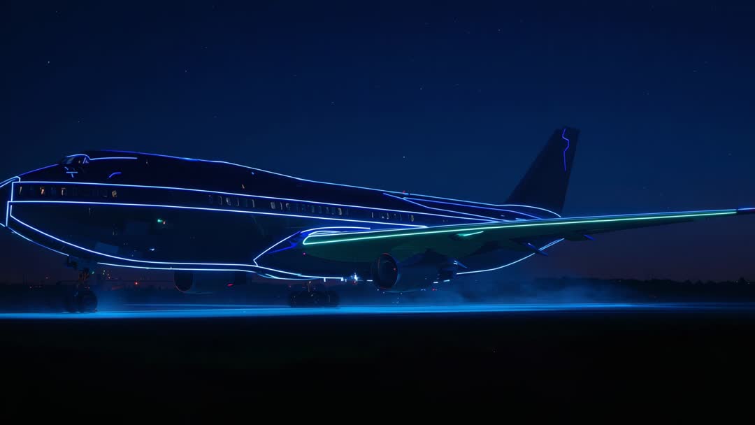 AI Generated Video. Footage showing large commercial jet taxiing at night with neon outline lights tracing fuselage and wings and blue mist hugging runway. High-contrast silhouette and glowing lines creating futuristic, cinematic mood while subtle cockpit glow suggesting crew presence. Low-angle composition emphasizing scale and motion during preflight taxi and engine spool-up, with vapor accentuating ground light trails. Ideal for technology and aviation commercials, sci-fi trailers, corporate travel branding, airport promotion, aircraft lighting product demos, broadcast openers, website hero banners, and social media teasers. Color palette featuring deep navy with cyan and teal highlights, fitting modern, high-tech storytelling and branding projects.