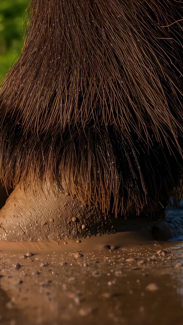 AI Generated Video. Close-up vertical video showing large furry mammal paw slowly sinking into muddy shoreline while weight shifting causing mud to cling and ripple. Frame focusing on fur texture, wet mud clumps and paw pad imprinting into soft substrate. Movement capturing slow, deliberate step, mud pulling loose and forming clods as paw lifts. Suitable for nature documentaries, wildlife behavior sequences, educational content about wetland habitats, conservation campaigns, social media vertical reels, outdoor adventure promos, and background clips for sound design and foley. Ideal for slow-motion treatment, cropping for horizontal layouts, overlaying text for title cards, or looping for ambient environmental scenes. Ready for stock libraries, editorial stories, commercial projects requiring tactile close-up wildlife detail.