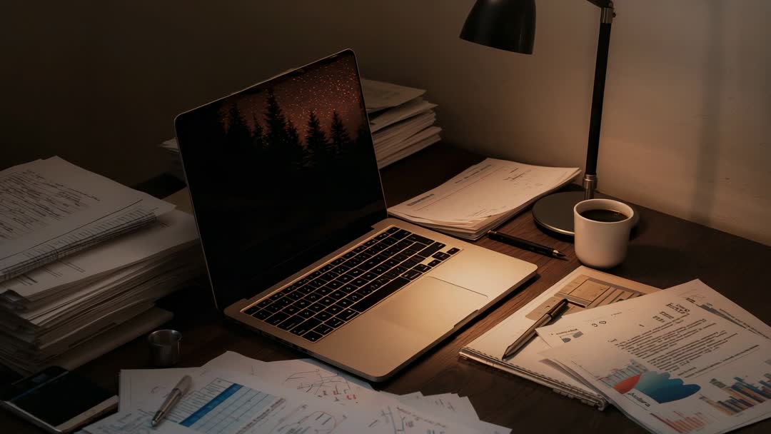 - Late Night Desk Workflow with Laptop, Stacks of Reports, Coffee and Warm Lamp Light