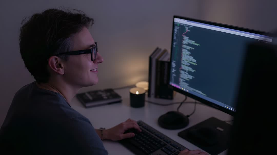 - Late-night remote developer coding at home desk with candlelit monitor and focused smile