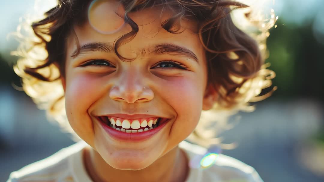 AI Generated Image. Short video clip capturing close-up of smiling curly-haired boy squinting into sun during golden hour, laughing and leaning toward camera. Backlit hair producing warm rim light; lens flare and soft bokeh creating dreamy outdoor atmosphere. Natural skin tones and candid toothy smile conveying joy, innocence and carefree summer mood. Ideal for family lifestyle advertising, childcare and pediatric health campaigns, social media content, blog headers, greeting cards and commercial video spots. Allowing room for text overlay and cropping for horizontal or square formats; compatible with hero banners, video intros and promotional ads. Shot characteristics: warm golden tones, shallow depth of field, tight framing and high-key backlight.